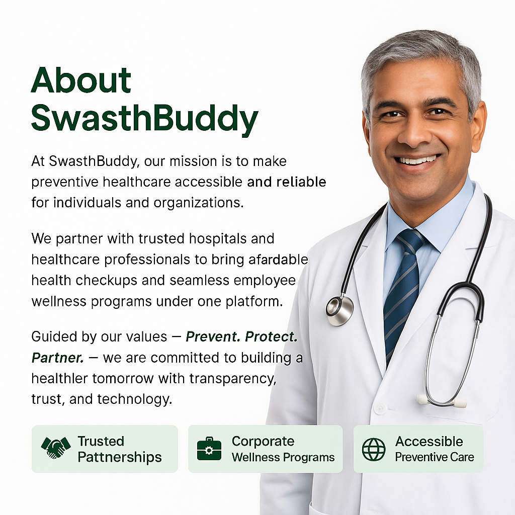 SwasthBuddy is a growing healthcare startup with a vision to simplify preventive health checkups. We connect individuals and corporate employees with trusted hospitals, doctors, and wellness programs. Guided by our values β Prevent. Protect. Partner. β we ensure accessible, transparent, and reliable healthcare for everyone.